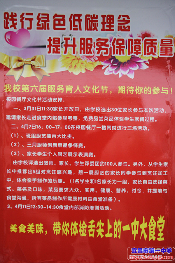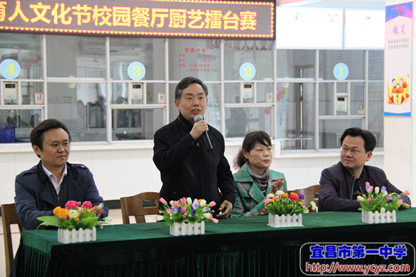 4月7日下午,宜昌市一中第六届服务育人文化节校园餐厅厨艺擂台赛在新食堂餐厅一楼隆重举行,30多位学生家长和高二年级的70多名学生品尝了厨师们精心烹调的佳肴,色香味俱全的美食获得了品尝者们的一致赞誉。