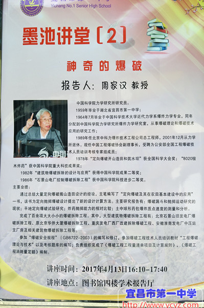 4月13日,中国科学院力学研究院研究员周家汉教授回到母校——湖北省宜昌市第一中学,在学术报告厅为高一学生作了一场精彩的《神秘的爆破》的科普讲座。副校长李大海热情接待并致欢迎辞。