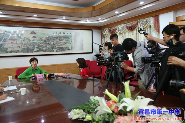 校长付全新对敬一丹老师的到来表示了热烈的欢迎,并陪同敬老师参观我校校园。当来到我校图书馆门口看到2016届高三毕业生三年阅读书目时,敬老师极为惊叹,一边拿出手机拍照,一边对一中学子热爱阅读的品质大加赞赏:“看了这么多书,涉猎这么广泛,难怪他们都考上了一流大学!”来到我校二楼会议室,敬老师接受了来自湖北、宜昌等多家媒体的现场采访,分享了自己的阅读经验,采访中,她多次称赞“一中学生的读书涉猎让人惊讶”。