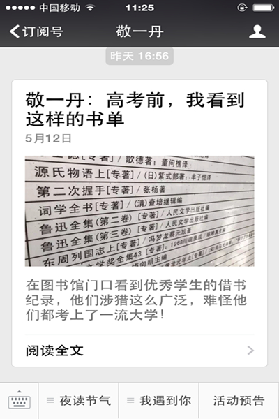 敬一丹老师在官方微信号上发文称赞一中学子阅读习惯