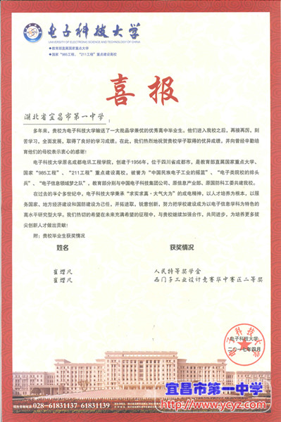近日,我校收到电子科技大发来的喜报。电子科大感谢我校多年来输送了一大批品学兼优的学子进入科大深造,这些学生在大学期间,刻苦学习,全面发展,在各个方面均取得了优异成绩:崔煜凡、王昱人和望馨等同学,分别获得“人民特等奖”、“人民一等奖”;崔煜凡同学还获得“西门子工业设计竞赛华中赛区二等奖”;王昱人同学获得“中国大学生程序设计大赛银牌”。电子科大希望双方在未来继续加强合作,共同进步,为培养更多拔尖创新人才做出贡献。