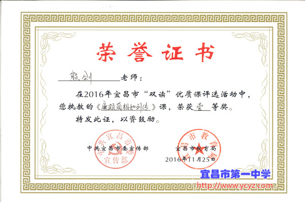 在宜昌市委宣传部、宜昌市教育局联合举办的2016年宜昌市“双读”优质课评比活动中,我校熊剑老师所执教的《廉颇蔺相如列传》语文课,荣获得一等奖。我校谈怡、高皓两位老师指导的《新制布裘:茅屋为秋风所破歌》被评为“双读”优秀展演节目一等奖。