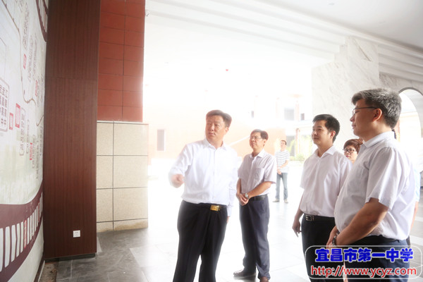 市教育局党组成员、市委高工委专职副书记翟秀刚(左二),校长付全新(左三),点军区委副书记、区长 高杰(左四),宜昌市人民政府副市长、党组成员唐超(左五),校党委书记陈鹏(左六),市教育局党组书记、局长覃照(左七)
