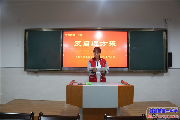 我校副校长闫明代表学校致欢迎词,他首先引用宋代著名诗句“我住长江头,君住长江尾,日日思君不见君,共饮长江水”,表达了对来访师生的热烈欢迎。百闻不如一见,虽然我们两校师生能通过各种渠道了解对方,但亲身体验才能更真切的感受对方。闫校长又表示,上海复旦附中是首批“上海市实验性示范性高中”之一的全国知名学校,以校训“博学而笃志,切问而近思”的上海复旦附中与“尊贤、励志、崇实、求新”的宜昌一中交流,一定能碰撞出美丽的思想火花——了解、友谊和进步。