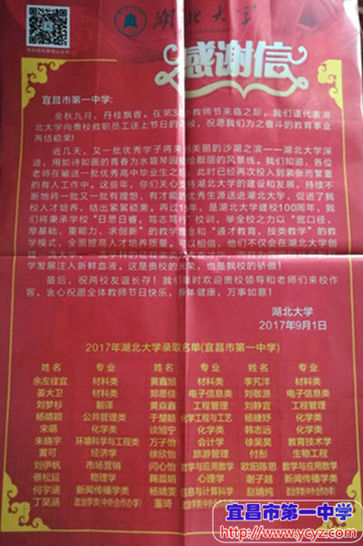 近日,我校收到湖北大学发来的感谢信。信中写道:感谢宜昌一中培养了大批优秀学子,今年又为湖北大学送入大批新鲜血液,这是宜昌市第一中学的光荣,也是湖北大学的骄傲。希望两校友谊长存,为祖国的教育事业再添辉煌!