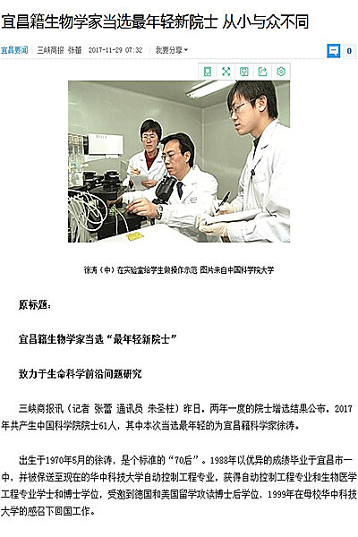 三峡商报讯(记者 张蕾 通讯员 朱圣柱)昨日,两年一度的院士增选结果公布,2017年共产生中国科学院院士61人,其中本次当选最年轻的为宜昌籍科学家徐涛。
