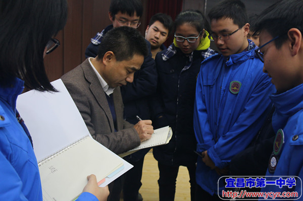 最后,陈鹏书记进行总结发言,他选读了《人物》杂志2017年12期中对张教授的专访文章中的片段,引用权威部门对他的评价。陈书记盛赞张教授关爱学生、热爱宜昌、有家国担当,是位平易、睿智、有情怀的杰出人物,同时也希望一中学子见贤思齐,向张教授学习。