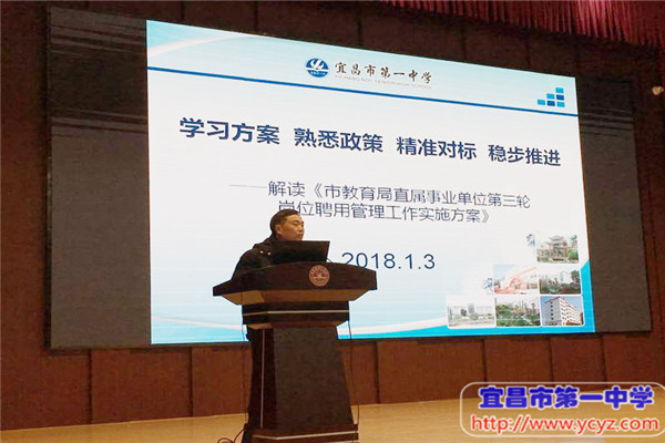 2018年1月5日,我校在新校区召开全体教职工大会,专题解读《市教育局直属事业单位第三轮岗位聘用管理工作实施方案》。