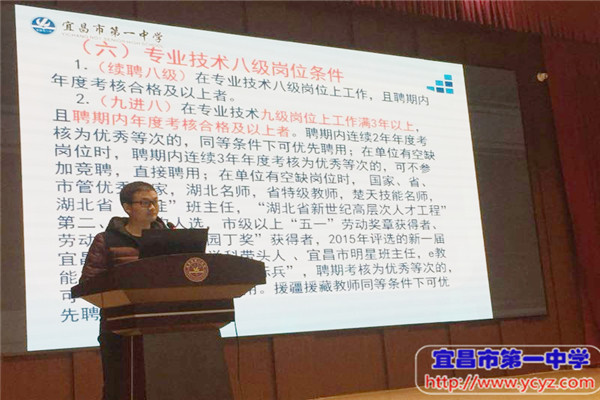 接着,学校办公室副主任贺飙分别从指导思想和目标,实施范围和对象,岗位类别、等级和结构比例设置,管理岗位基本条件,专业技术岗位基本条件,聘期管理,岗位聘用工作程序,市整体情况及我校摸底现状等方面解读《实施方案》。