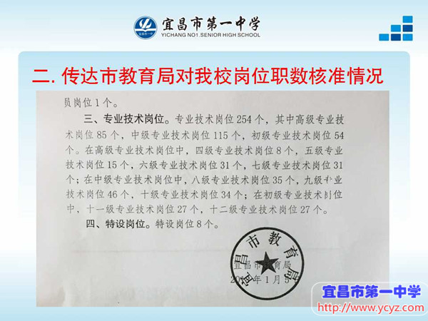 我校召开第三轮岗位聘用管理工作动员大会 2018-01-20 10:14:35 2018年1月19日,我校召开第三轮岗位聘用管理工作动员大会,校办副主任贺飚主持会议并对全体教师进行宣讲。 贺主任主要就《宜昌市第一中学第三轮岗位聘用管理工作实施方案》的定稿过程面对全体教职工进行了说明,反馈了市教育局对我校《实施方案》提出的修改意见,传达了市教育局对我校岗位职数核准情况,并对职数核准的依据做了详细解读,同时,他认真分析了我校专技岗位职数现状,让每一名教师做的心中有数,并对后期岗位竞聘工作需要注意的事项做了提醒。 本次岗位聘用管理工作动员大会,让老师们进一步熟悉了政策、了解了竞聘现状,为我校第三轮岗位聘用管理工作顺利开展奠定基础。