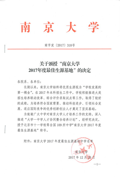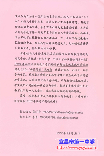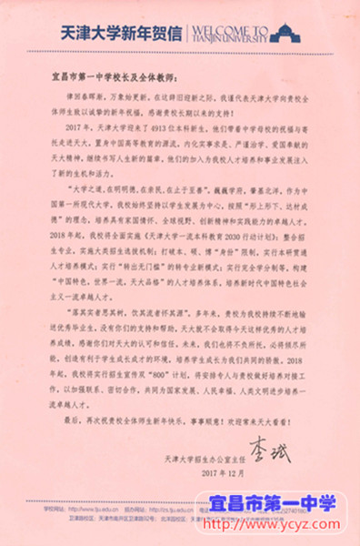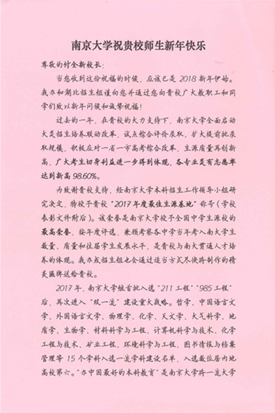 本月初,我校收到南京大学校长办公室的来函,里面有对付全新校长及全体教师的新年贺信、基地学校决定文件等;同时也收到天津大学的新年贺信。严冬季节,读来让人觉得格外温暖。湖北本次共有四所学校入围南京大学2017年度最佳优秀生源基地名单。