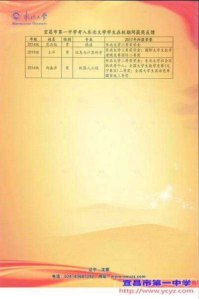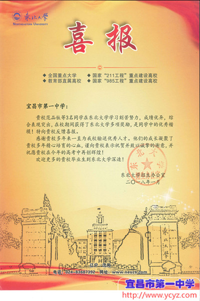 开学第一天,我校分别收到复旦大学、东北大学的贺信和喜报。来信称我校2014级范品钛、2015级王洋、2016级向鑫彦、董伊婷等同学在复旦、东北大学就读期间,求真求知、弘毅笃行,秉承宜昌一中优良学风,在本学年度荣获国家奖学金、国际大学生数学建模竞赛国际二等奖等,特向宜昌一中母校报喜!