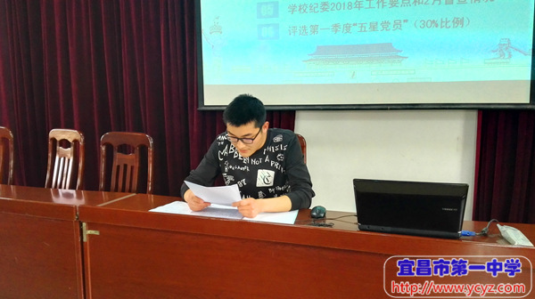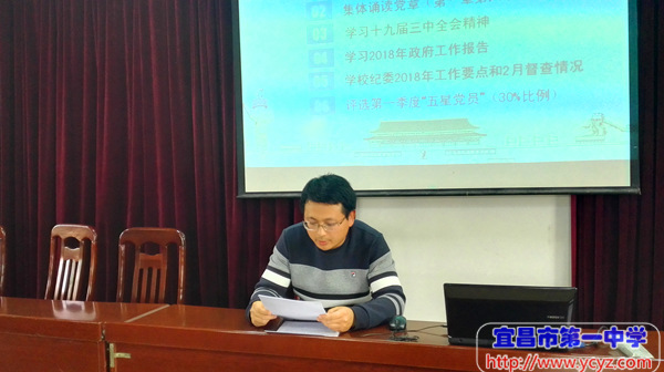在全体党员现场交纳党费,重温入党誓词,集体诵读党章,评选第一季度五星党员后,组织委员熊江华同志、宣传委员熊剑同志分别带领党员们学习了十九届三中全会精神和2018年政府工作报告极,纪检委员陈少文同志传达学校纪委2-3月督查工作情况。
