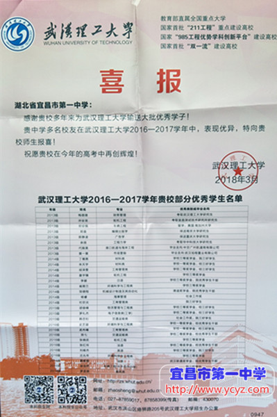 昨日,我校收到来自武汉理工大学的喜报。喜报称,武汉理工大学感谢宜昌市第一中学多年来为他们输送了大批优秀学子。特别通报了2013级梅璐璐同学考取武汉理工大学研究生;2013级郑安琪同学留学美国加州;2013级郑垒同学保送南京大学研究生等;2014级杨睿同学就读海事管理,获得“社会工作奖”;2014级杜钦炎同学、2016级徐浩然等同学获评“院三好学生”。