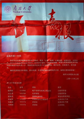 近日,南开大学给我校发来喜报。喜报称,我校毕业生徐馨、陈雨歌等在南开大学学习学校期间,秉承“公能”精神,认真刻苦,成绩优异,全面发展,在2017年度各类奖学金评审中,获得学校嘉奖,并衷心地感谢贵校多年来向我校输送多名优秀人才。
