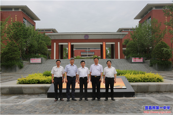 左起:翟秀刚(市教育局党组副书记、市委高校工委专职副书记),覃照(市教育局党组书记、局长),陶宏(省教育厅党组书记、厅长),付全新(宜昌一中校长),叶爱华(市政府副秘书长、法制办主任)