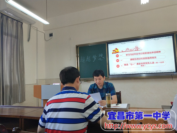 徐海波同志组织全体党员认真学习、领会习近平总书记视察湖北讲话精神,通报五月纪检督查值周情况;全体党员现场推选“七一”表彰优秀党员人选及第二季度“五星党员”;随后,针对2017年支部民主生活会和民主评议党员情况,支部和党员个人分别列出整改清单和整改措施并向大会通报支部整改情况;之后,徐海波同志带领党员学习了《市教育局直属机关党委关于支部分类定级工作方案》;校长付全新同志强调,党员同志要不断向老党员学习无私奉献的精神,展现良好的精神风貌。