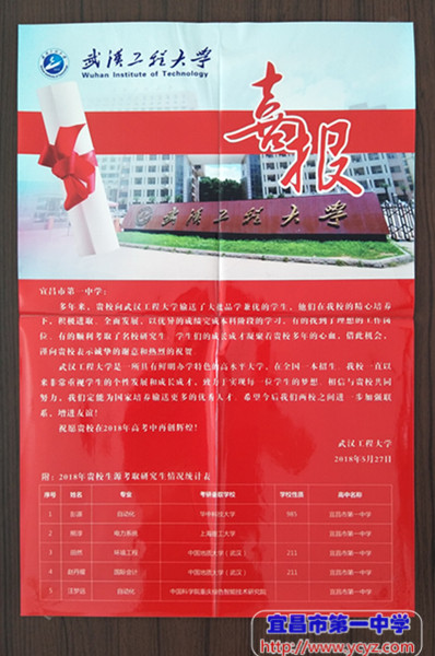 近日,我校收到来自武汉工程大学的喜报。报道称,我校彭源等五位往届优秀毕业生校友,经过本科四年的顽强拼搏,于今年分别考取华中科技大学、上海理工大学、中国地质大学、中科院重庆绿色智能研究院等研究生院的研究生,特此报喜。