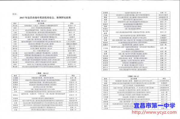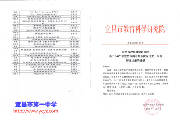 近日,从市教科院获悉,我校多位教师在2017年全市高中英语优秀论文、案例评比中获奖;其中我校罗凤英老师的《英语阅读“七选五”命题特征与解题策略浅析》、靳青老师的《基于核心素养的高三英语复习课教学》、彭桔老师的《透过2017年高考谈完型填空备考策略》获得论文评比一等奖;蔡留青等七位我校老师的论文分别获得市二等奖。