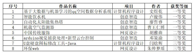 中央电教馆举办的第十九届全国中小学电脑制作活动夏令营将于2018年7月16-21日 在江苏省无锡市举行。我校史煜乾同学的作品《基于大数据与机器学习的QQ空间数据分析系统》、卢骏伟同学的作品《智能饮水机》将代表湖北省参加全国现场决赛。