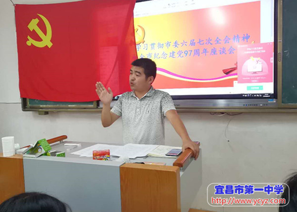 8月27日下午,我校高二支部全体党员在一中新校区二号教学楼一楼合班教室,举行以“学习贯彻市委六届七次全会精神和全市纪念建党97周年座谈会精神”为主题的支部党日活动。本次支部党日活动由支部书记蔡利鹏同志主持。