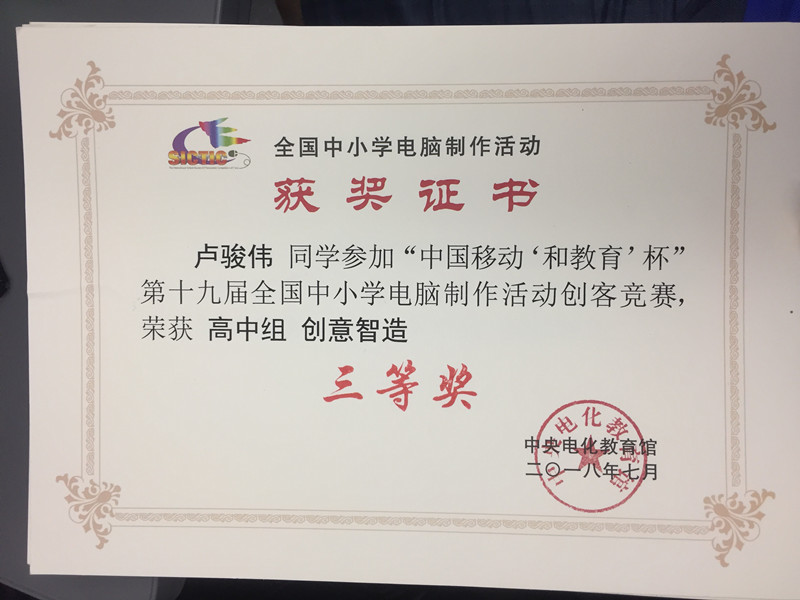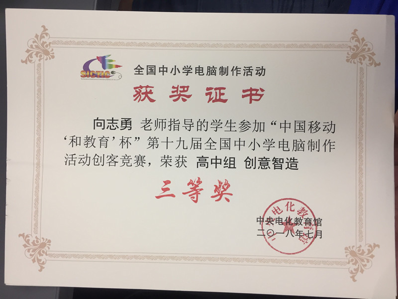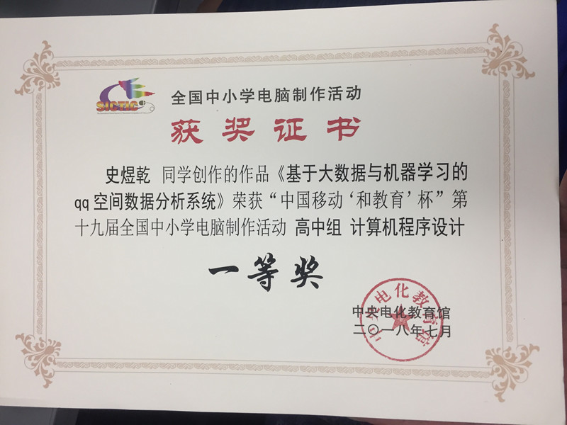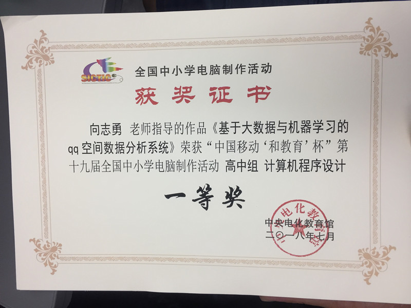 为期四天的比赛上,我校史煜乾同学开发的作品《基于大数据与机器学习的QQ空间数据分析系统》技术与创新都名列前茅,并且在技术测试、展示、答辩等环节中表现突出,获得评委组的一致好评,获全国一等奖(第一名)。卢骏伟同学现场制作的作品《智能轮椅辅助装置》,荣获“创客竞赛 高中组 创意制造”全国三等奖。我校向志勇老师荣获指导教师一等奖。