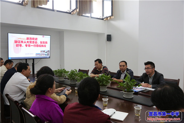 考察团一行首先参观各个学科教室,并对我校数字化的办学条件、先进的办学育人理念、良好的育人氛围给予高度评价。在墨池书院,考察团听取了关于我校历史的介绍。随后,在三楼党委办公室召开的座谈会上,陈书记详细介绍我校在信息化办学、教育教学、招生、校际合并等方面的情况。大家畅所欲言,并就共同关心的问题展开了热烈的交谈。朱道晶主任一行表示宜昌一中很多管理理念和教育教学做法都走在前面,给他们很多启发,让他们满载而归。