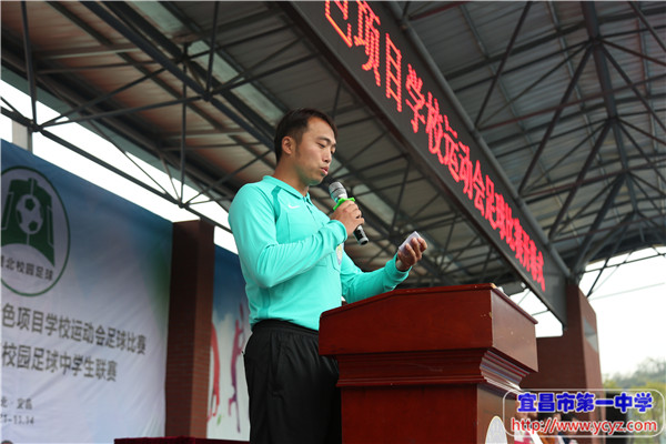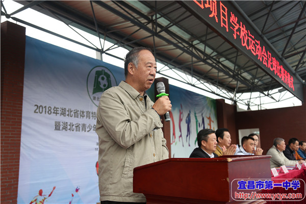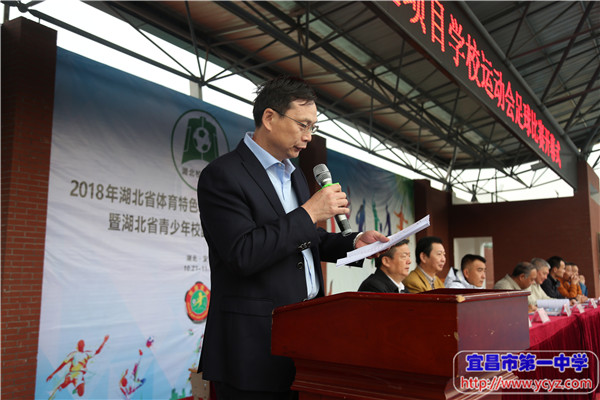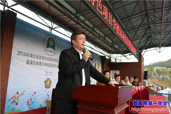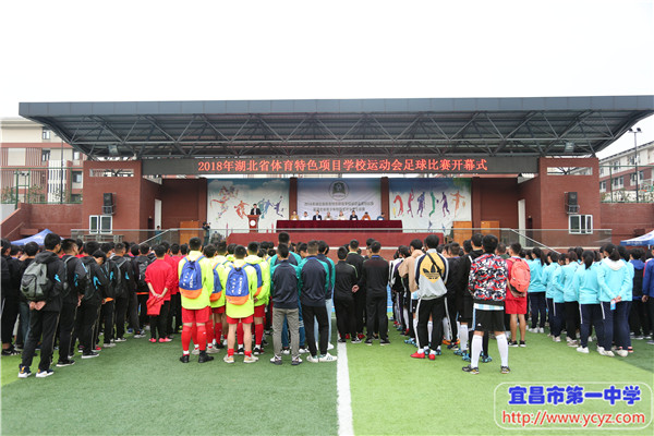 2018年湖北省体育特色项目学校运动会足球比赛开幕式在我校运动场隆重举行。出席本次开幕式的领导有:湖北省教育厅巡视员杨跃、湖北省体育局青少年体育处处长徐彦、湖北省教育厅体育卫生与艺术教育处调研员缪胜杰、宜昌市教育局调研员张金华、宜昌市教育局体卫艺科科长王书洲、我校副校长李大海、赛会裁判长周刚、武汉体育学院足球教研室副主任谢朝忠。来自我省各地区共33支代表队参与了本次盛会,我校校长付全新主持本次开幕式。