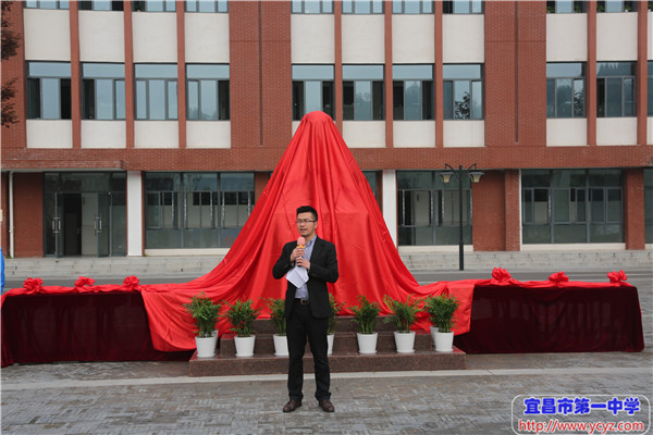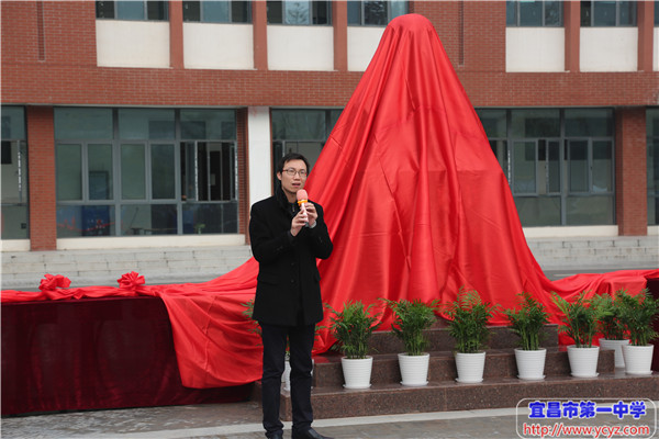 揭幕仪式上1720班刘柯尔发言,她首先回顾了董老与同盟会会员、时任我校教师的余祖言先生深厚的革命情谊,接着她号召全体新时代的青年应该传承前辈意志,与时代携手共进,向着远方更加灿烂的朝阳勇敢地进发,让五星红旗更加骄傲地飘扬!随后,党委书记陈鹏致辞。陈书记在致辞中详细讲述了董老与宜昌一中的渊源,同时他鼓励全体同学在新的历史时期,不忘初心,牢记使命,继续为实现中华民族的伟大复兴梦而努力。随后,与会领导、嘉宾与参与揭幕仪式的同学们前往董必武铜像前揭幕,并在铜像前合影留念。