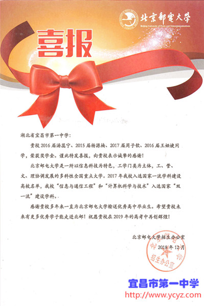 近日,我校收到北京邮电大学发来的喜报。喜报称,我校2016届汤蕊宁、2015届杨源楠、2016届周子钦、2017届王娅婕同学,荣获2018年北京邮电大学奖学金。特此报喜!