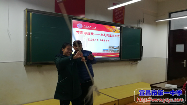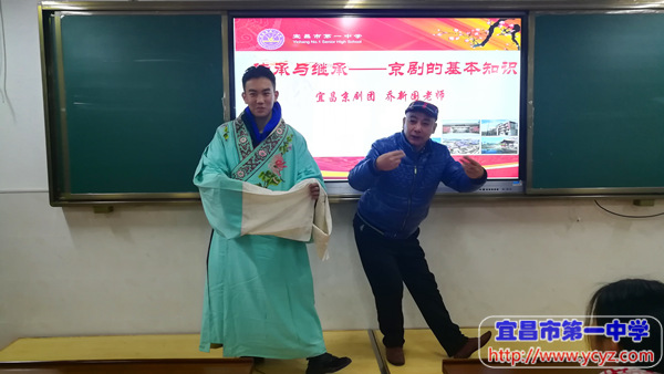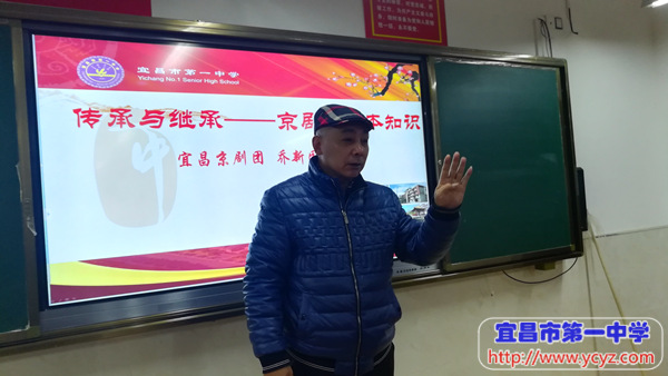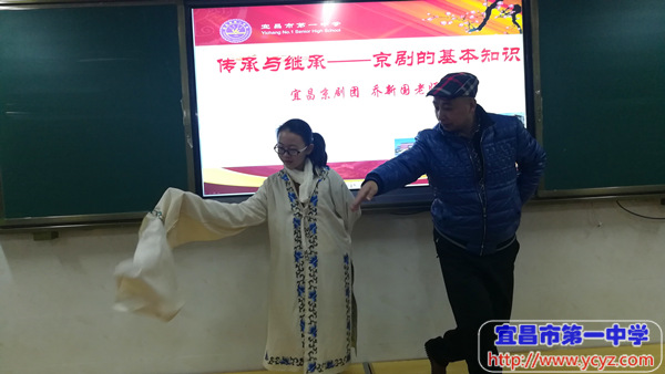 12月25日中午,宜昌市京剧团乔新国老师专程来到我校,为我校高一学子带来了一堂题为《传承与继承——京剧的基本知识》的京剧课。授课活动由学工处副主任唐志海老师主持,高一年级副主任熊剑老师及部分班主任老师参与。