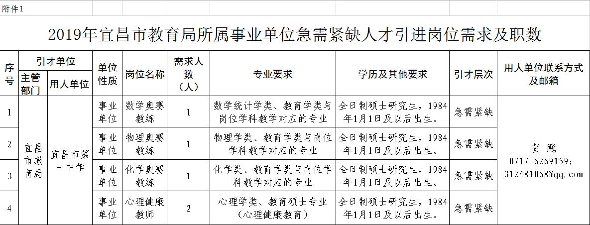 每个岗位的人才引进条件详见《2019年宜昌市教育局所属事业单位急需紧缺人才引进岗位需求及职数》(附件1)。