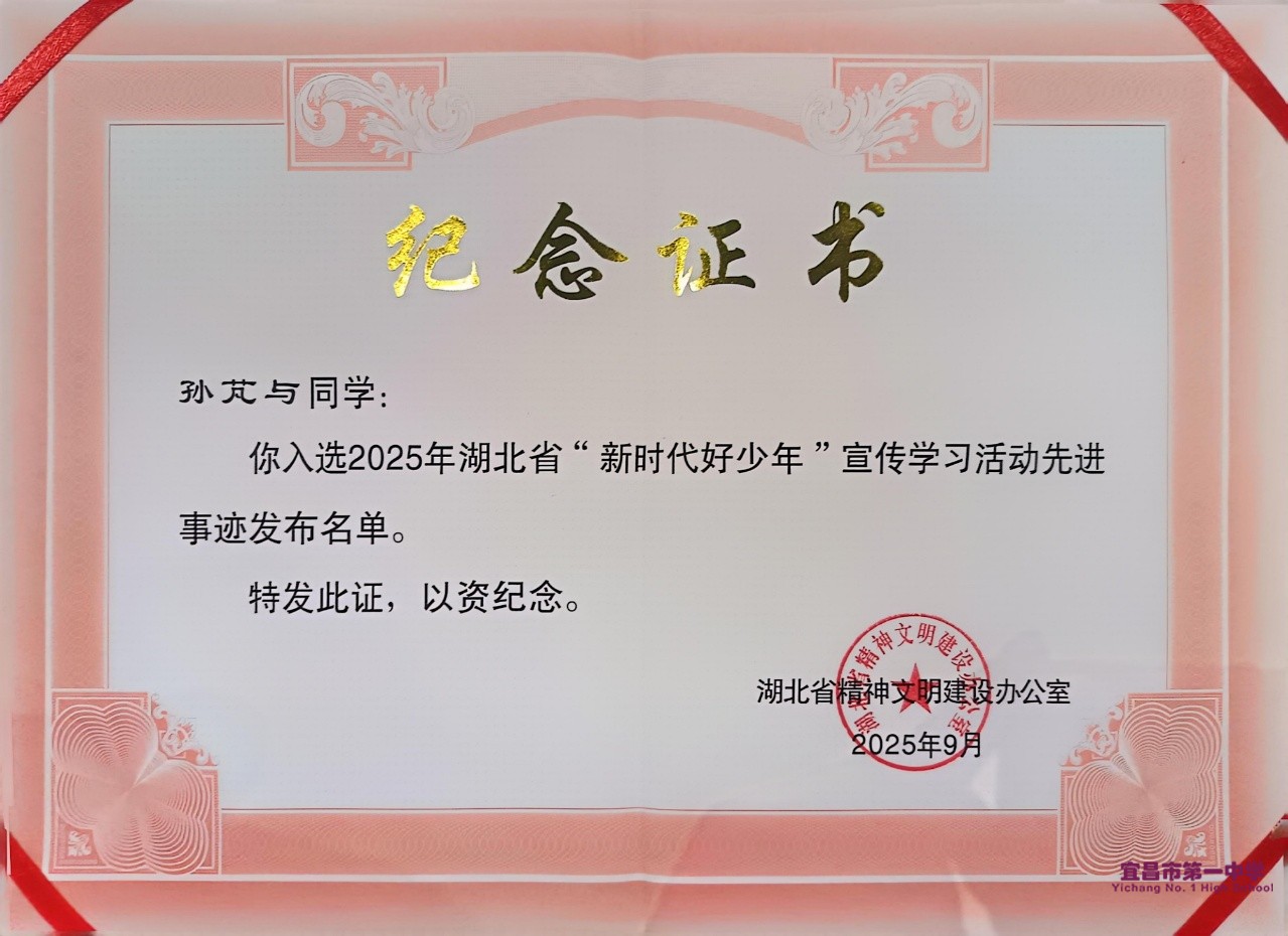 近日,由湖北省文明办、湖北省教育厅、共青团湖北省委、湖北省妇联、湖北省关工委联合主办的2025年湖北省“新时代好少年”先进事迹发布仪式在宜昌三峡融媒体中心一号演播大厅举行。我校孙芃与同学凭借在科技创新领域的突出成果和引领同伴共同进步的责任担当成功入选2025年湖北省“新时代好少年”。