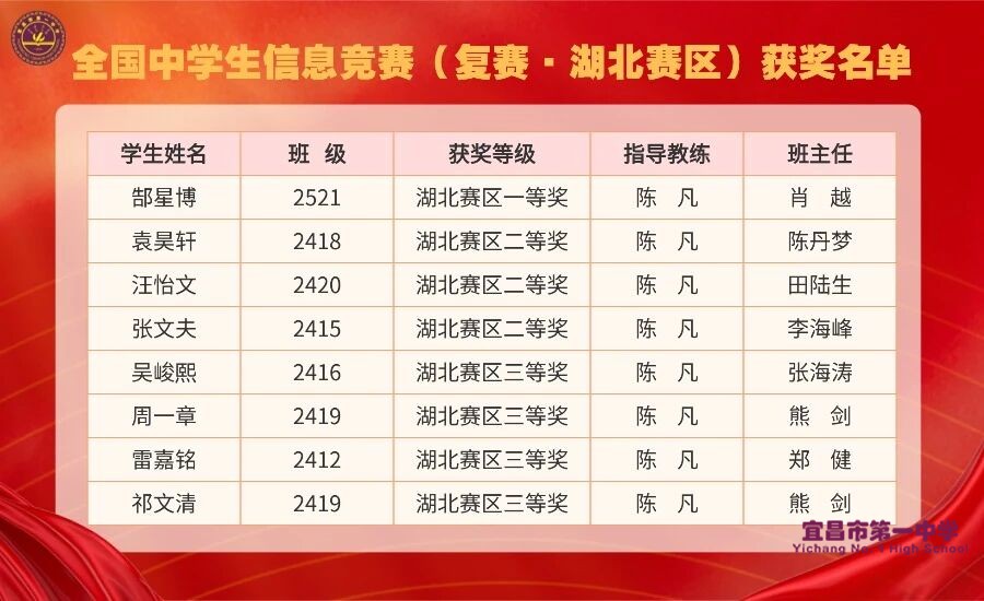 2025年第31届全国中学生信息竞赛(复赛·湖北赛区)成绩揭晓,我校共有8名学子获奖,其中高一学生郜星博获全国一等奖名列全省高一学生第10名。向所有获奖的同学表示热烈的祝贺!向竞赛教练团队以及为此辛勤付出的班主任、年级组表示衷心的感谢!