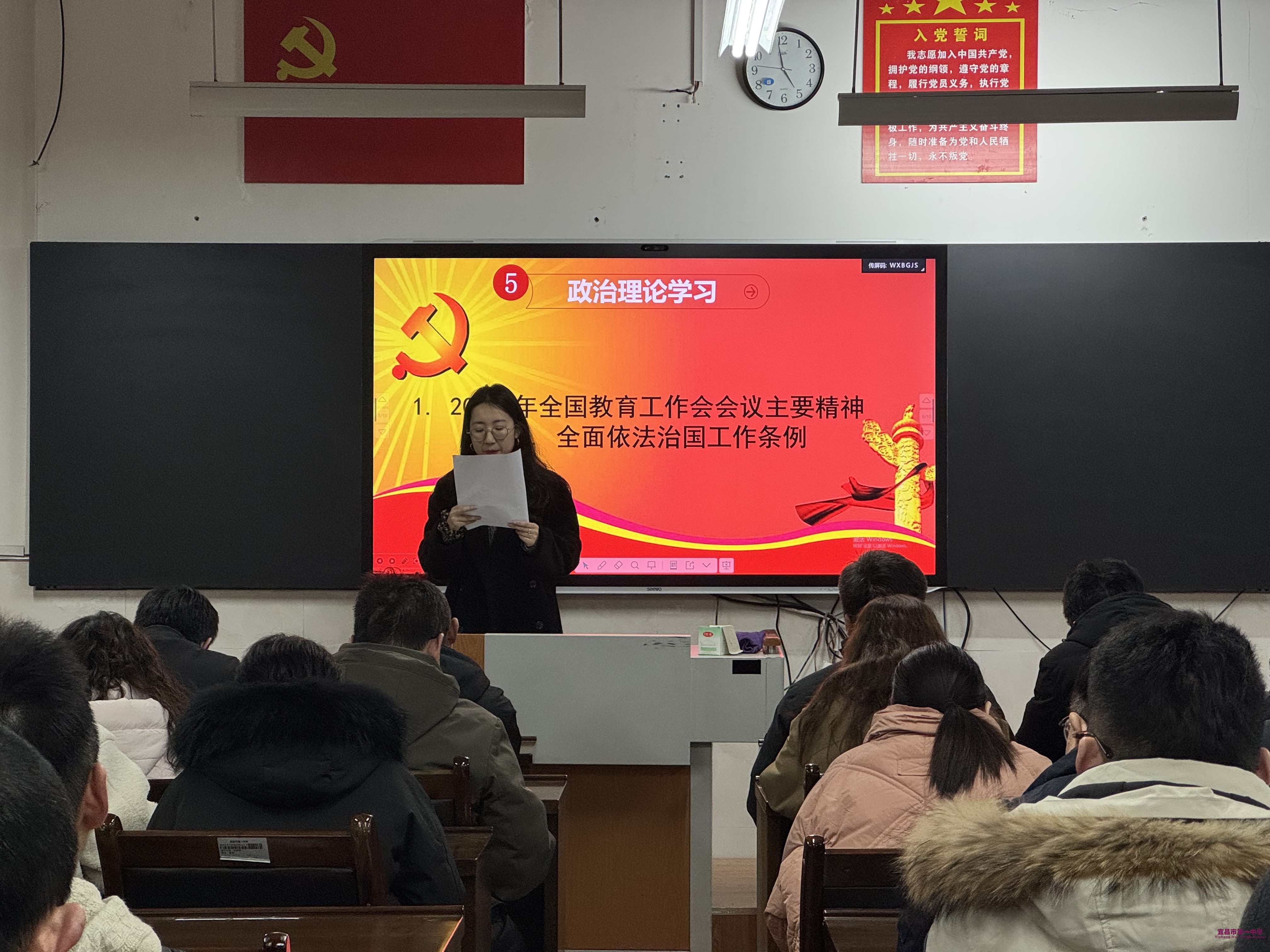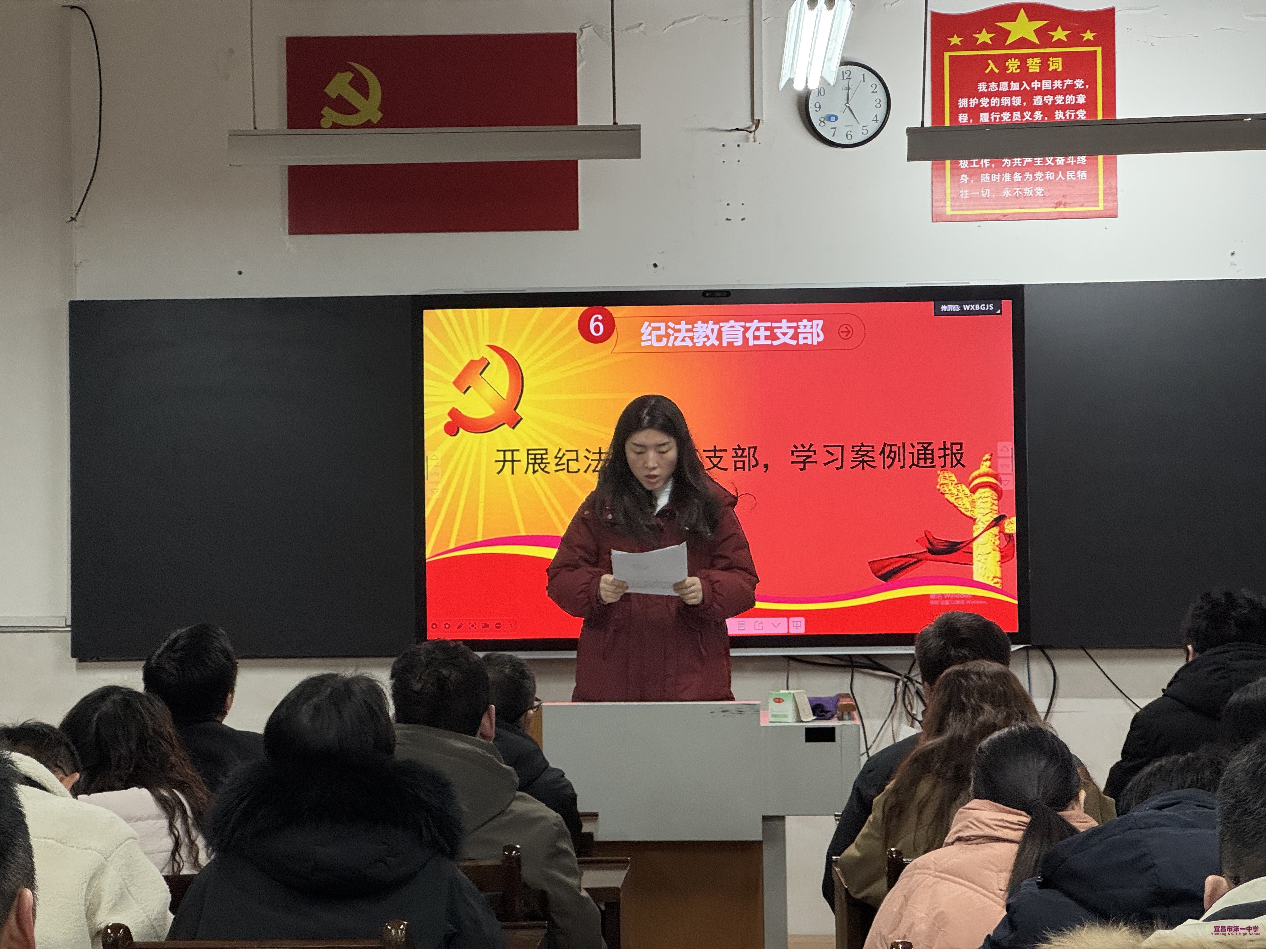 政治理论学习环节,谭玉园、彭盈带领全体党员集中学习了2026年全国教育工作会议主要精神及《中国共产党全面依法治国工作条例》,聚焦教育高质量发展与法治建设要求,明确新时代党员教师的责任方向。纪法教育在支部活动中,王苗郁领学近期违纪违法案例通报,通过以案为鉴,引导党员严守纪律红线,筑牢思想防线。